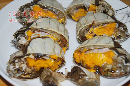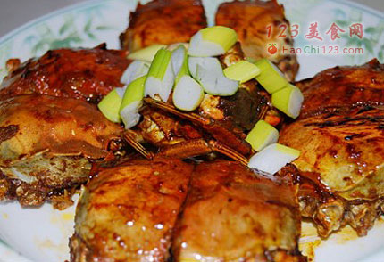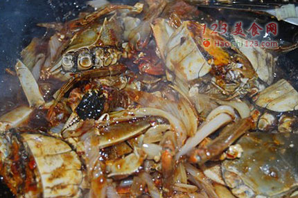 3、将葱倒入锅中爆炒,然后加入大闸蟹一起翻炒,炒至螃蟹壳红了,就倒入事先调好的汁一起炒(烤肉酱+辣椒油+醋+料酒)。