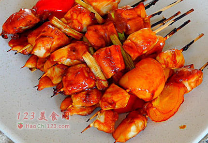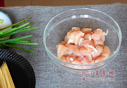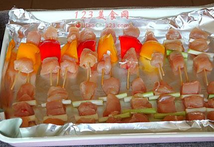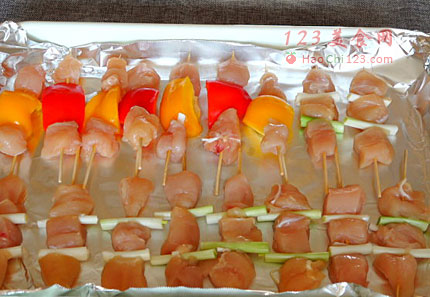 5、把鸡肉串穿好,放在烤架上,建议放在烤架上烤出来好吃。