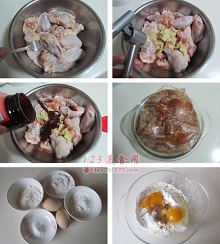 1、鸡翅和鸡翅根须提前腌制,加入适量的盐、辣椒粉、姜蒜末和海鲜酱等腌制入味,为了更容易入味,先须用叉或者牙签在鸡块上叉些小孔,带上一次性手套帮助拌均匀后放入保鲜袋中,再放入冰箱中冷藏两个小时。