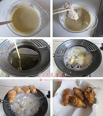 3、炸鸡翅时油温不易过高,以筷子插进去旁边有气泡冒出,放入鸡翅进去,中小火炸上十分钟捞出;再转为大火,将鸡翅放入里面复炸,炸至金黄即可。[LaoYanHuo.com]