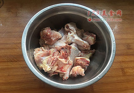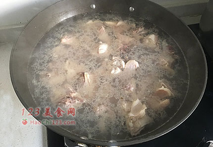 2、锅子烧开水,将鸡肉放入焯水1分钟(变色捞出即可,投入温水中洗净,控干水份)。