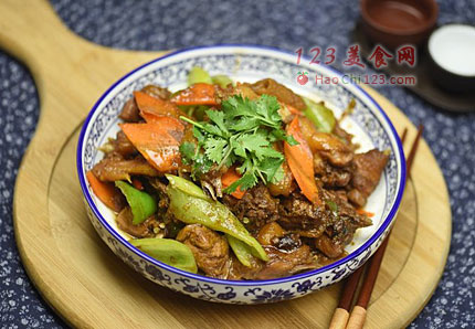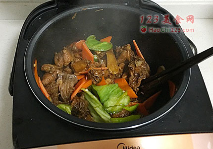 6、放入切好的青辣椒和胡萝卜片(胡萝卜切菱形片,会更美观。先切宽约5厘米的段,然后截面朝下,切片即成菱形片),搅拌均匀,至胡萝卜略软,出锅即可(蔬菜过于熟烂导致营养流失,所以略软即可出锅)。