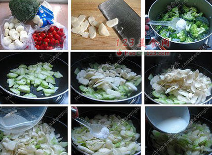 2、锅中座油,先把切好的西兰花梗放进去炒制一分钟左右。