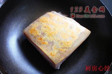 2、五花肉块洗净以后,用一个平底的铁锅,不用放油,将肉皮朝下,反复烙制,烫皮;去毛,肉皮吃起来会很香。