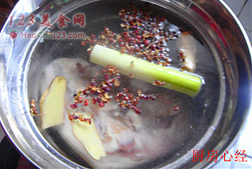 3、然后,锅中注满凉水放入五花肉,葱姜花椒料酒,煮制30分钟。
