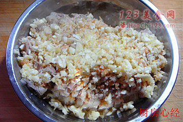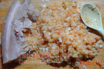4、肉块煮熟以后,自然冷却,切成夹刀片,就是肉皮不切断。然后在二片肉之间,放入海米碎(提前泡软)、葱姜末、料酒。