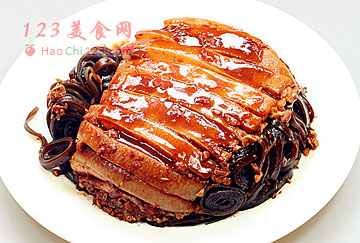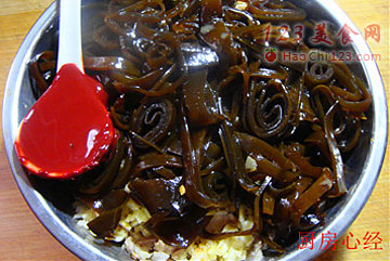 6、然后撒上海带丝,浇上二到三勺腐乳汁、料酒、酱油少许,即可上火蒸制1.5个小时。