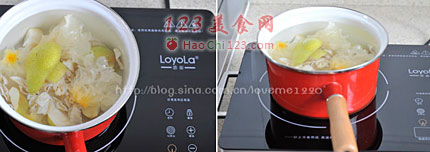 10、把温度调到200度,盖上盖子,煲1个半小时就可以了。(如果不是电陶炉就放在火上开锅之后最小火煲1个半小时就好了)汤煮好之后放入适量冰糖,放凉之后放入冰箱即可。