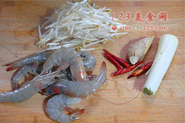 2、草虾洗净,去虾线、虾须、虾枪,葱姜、干辣椒备用。