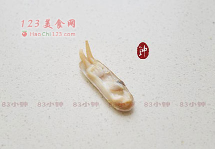 3、待不烫手后,剪掉没有蛏子肉的另一半蛏壳,清理掉蛏子边缘的黑线。