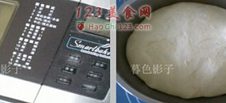 2、面包机设置:程序7,揉面33分钟,揉面结束拿出来隔热水发酵,大约40分钟左右。
