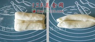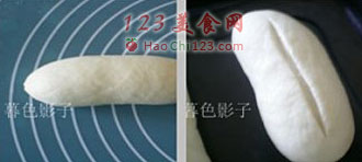 4、从上下端卷起来,捏好俩端,整理成如图长型,整形放烤盘里,表面上用刀割一公分左右。
