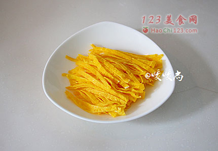 3、鸡蛋加半克的盐打散,平底锅内放少量的花生油,分次倒入鸡蛋液小火摊成鸡蛋饼。鸡蛋饼晾凉后切丝。