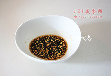 5、陈醋、盐、香油、白糖、芥末油和白芝麻调匀作为料汁。