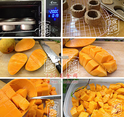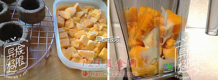 14、芒果冰放入破壁机中并加入炼乳,用沙冰功能将其打成沙冰,将沙冰装到燕麦做的容器中撒上黑燕麦片即薄荷,装盘,开吃啦。