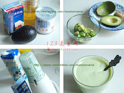 3、将牛油果丁混合少许牛奶,放入搅拌机。