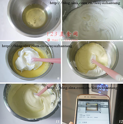 4、蛋黄糊和蛋白霜混合时,一定要用炒菜的手法翻拌均匀(从底部往上翻),手法不对蛋糊容易消泡。