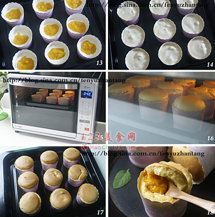 5、蛋糊倒入纸杯1/2高度处再放芒果泥,芒果泥放的位置偏高,会影响蛋糕中部的蓬发,造成凹顶现象;震的时候也不能太大力,容易让芒果沉底。