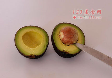 2、沿果核划开一圈,反方向一扭,就可将牛油果切成两半,用刀尖取出果核。