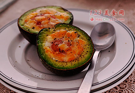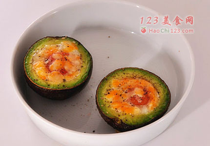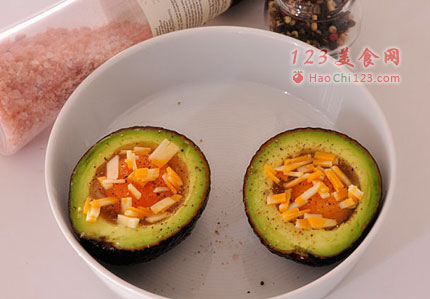 3、挖出牛油果中间的一部分果肉(直接放嘴里偷吃了),放入烤碗,每半个牛油果中间打入一个鸡蛋的蛋黄和半个蛋清(如果牛油果够大,是可能打入整个鸡蛋的;要不,用鹌鹑蛋喽!),撒上少许盐、现磨黑胡椒粉和芝士碎(任意品种,只要喜欢)。