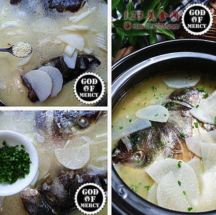 7、鱼头汤汁煮成奶白色浓汁时,用勺撇去浮沫,用中小火熬半小时,至汤色变白;烹入萝卜片。继续煮二十分钟大概20分钟左右,白萝卜变软也透明了。