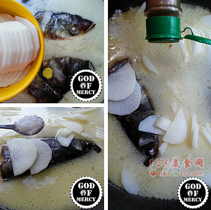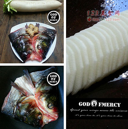 3、萝卜煮鱼头,为了鱼头的味道更鲜,首选脆嫩的水萝卜。[LaoYanHuo.com]