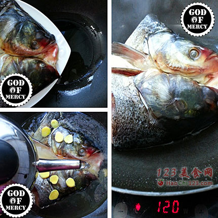 5、为了口感和色相,我只煎炸鱼头剖开的一面,水分可以被油炸干变香,而且汤汁很容易煮成白色的浓汤。鱼脸的皮让它保持原有的模样不要煎炸,好看又好吃。