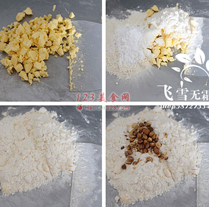 2、倒入过筛后的低筋面粉、糖粉、盐。
