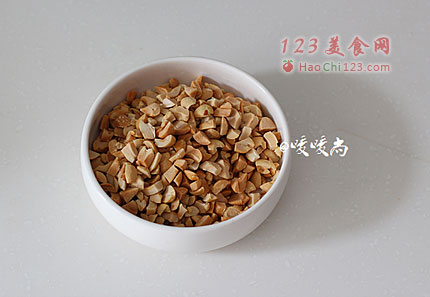 2、烤箱提前预热至170度,将花生米放在烤箱中层,上下火烤10分钟后取出晾凉、去皮,切成花生碎(没有烤箱,直接用平底锅炒熟一样的效果)。