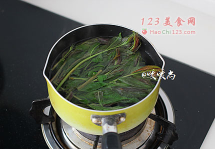 3、开一小锅水,将洗好的香椿用热水焯1分钟左右。