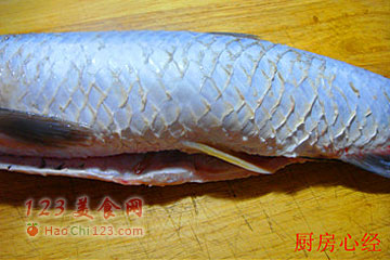 2、草鱼洗净后,最不容忽视的就是用90度温水,反复浇烫鱼皮,然后趁热刮去鱼皮表面的黑膜,鱼皮才漂亮洁白,做出来的鱼肉才会红润有光泽。但是水温不要太高,刀挂还要小心,否则鱼皮容易破。
