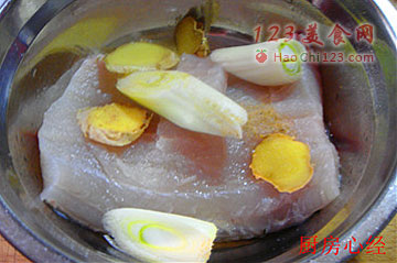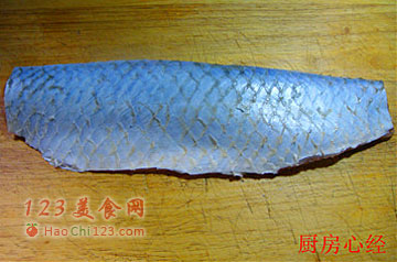 4、红烧肚档只取鱼身的中段,也就是鱼腹的二側。剩余的可以煮汤。将鱼腹切成佛手的形状,便于入味。