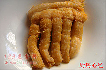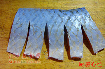 6、炸之前,鱼身轻轻的掸上一层薄面粉,肚档成熟之后的形状好看。