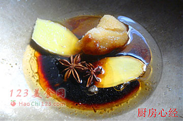 8、锅中需要炒制一个酱油白糖的汤色:生油、白糖、酱油、八角、姜片,一起放入锅中,不断的搅拌,直到起泡为止。