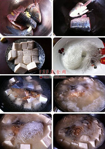 5、鱼汤煮开后加入豆腐继续煮至汤汁变成奶白色,这时放入粉丝和胡椒粉略收下汁,烹入盐即可。