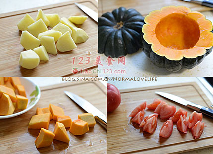 2、3、选个扁圆型的南瓜,切下上面的1/3切滚刀块用来烹饪,留2/3的南瓜盅拿来做餐具,将里面的籽和絮用大勺刮干净清洗一下。