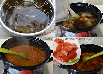 6、加适量清水将土豆、南瓜炖煮至软(水位基本跟食材齐平即可),然后加入红咖喱酱和椰浆。