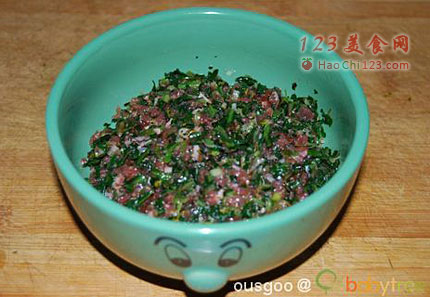 2、将肉馅、葱末、蒲公英放在一起,加入盐、胡椒粉、五香粉、香油、酱油,搅拌均匀。记住:拌馅一定要朝着一个方向来搅拌。