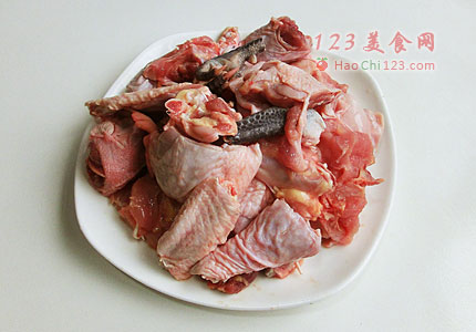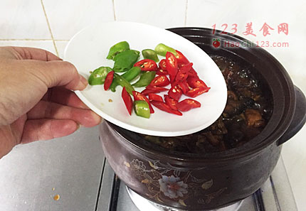 6、然后,再转移到砂锅中,大火烧开,小火烧至鸡肉烂熟。出锅时放入青红椒翻炒均匀即可。