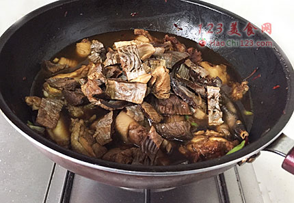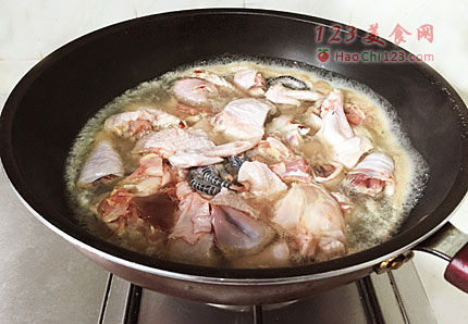 5、直接将焯过的鸡块倒入锅中,下糖、料酒、生抽、盐、甜面酱炒匀。再加入适量热水,下入笋干。