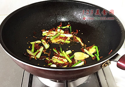 4、锅中放油,下入姜、葱、干辣椒炒香。