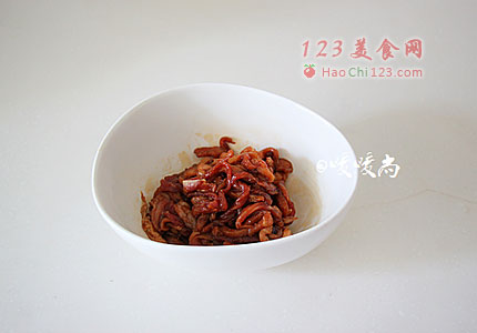 2、里脊肉切丝,加盐2g、老抽、料酒和玉米淀粉拌匀腌制15分钟。