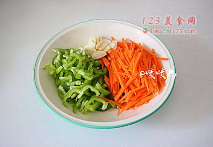 3、大蒜切片,尖椒和胡萝卜洗净切丝。
