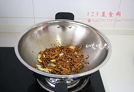 6、炒锅烧热后放入适量的花生油,下腌制好的肉丝快速翻炒至变色,然后下蒜瓣炒出香味。
