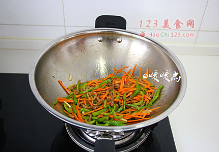 7、放入切好的尖椒、胡萝卜丝,调入2g的盐翻炒至胡萝卜断生。