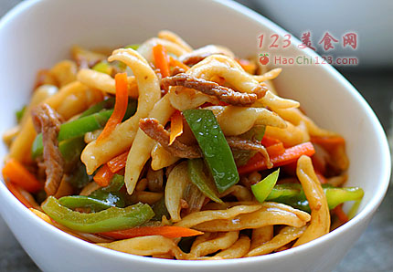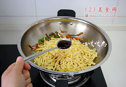 8、下煮好的剪刀面,调入一大勺的蚝油和3g的生抽。翻炒均匀至剪刀面表面裹上蚝油汁,最后浇上一勺陈醋拌匀关火食用。