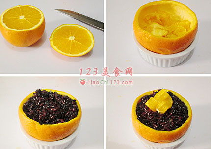 7、加入黑米饭,挤上橙子上半部的橙汁。