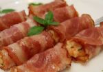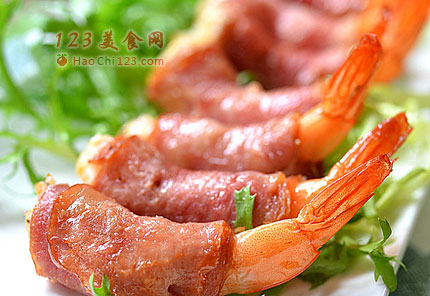 2、培根的收口处尽量放在虾卷的底部,这样成品才漂亮。