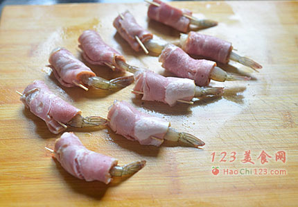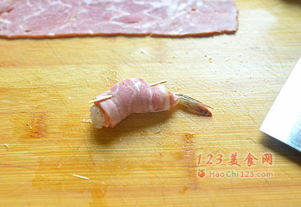 5、培根平铺放上腌好的虾卷起来,让虾尾露在外面,收口用牙签固定。