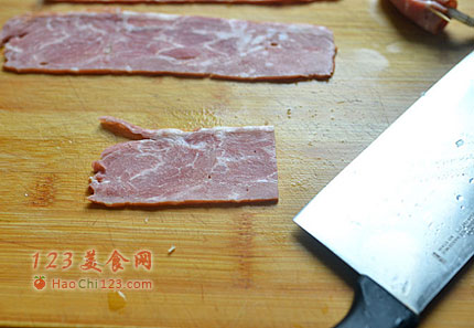 4、培根一片从中间切开分成二片。